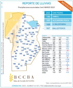 Las precipitaciones en el mes de marzo del 2021 tuvieron, en gran parte de los departamentos de la provincia de Córdoba, valores superiores a la media histórica.